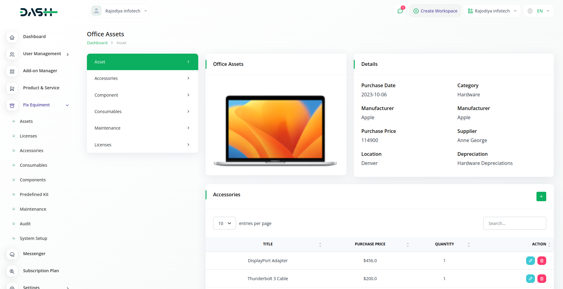 Establish module for managing equipment, facilities, vehicles and other assets based on industry standards. Keep track of individual assets and schedule, assign and record maintenance work.
